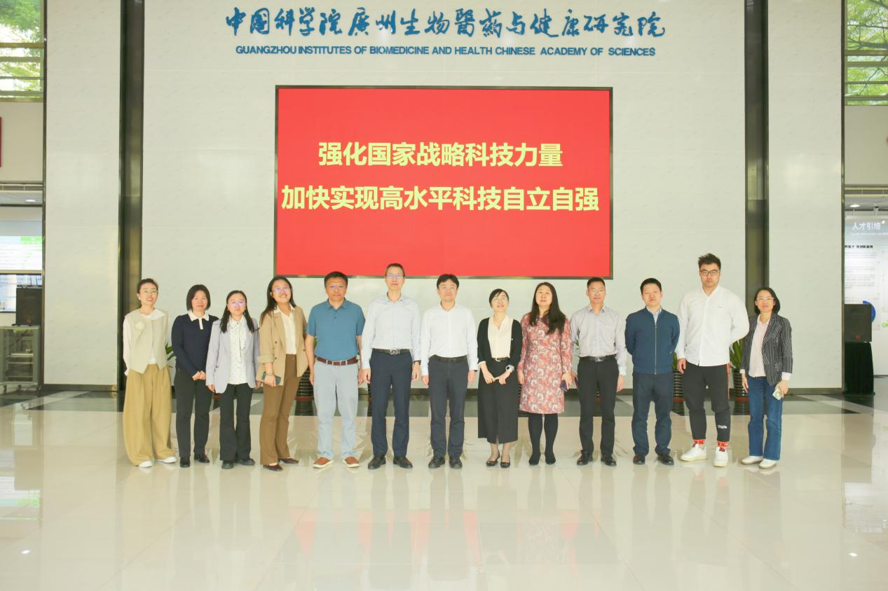 2026年3月16日,广州开发区科技创新局党组书记、局长段斌华,副局长吴云一行赴中国科学院广州生物医药与健康研究院(以下简称“广州健康院”)调研,广州健康院副院长(主持工作)孙飞、副院长蔡陈崚等参加调研交流。