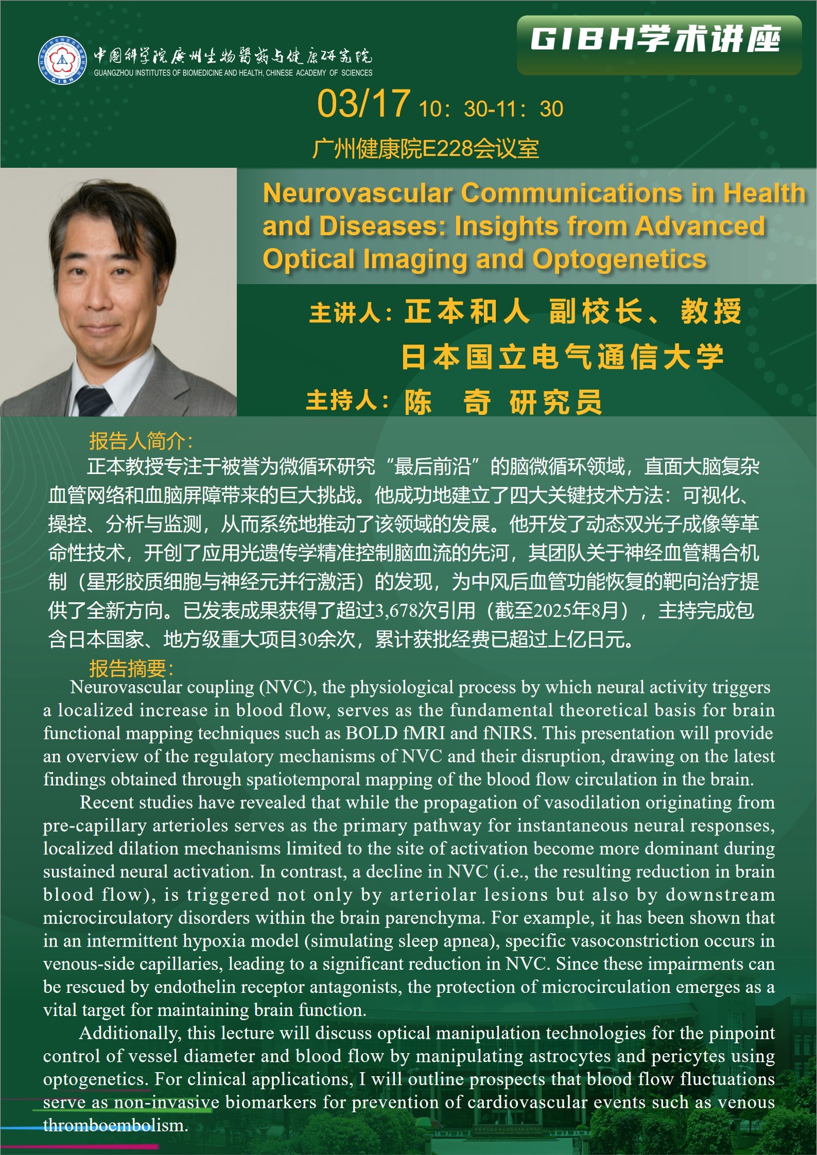 2026年3月17日学术讲座:Neurovascular Communications in Health and Diseases: Insights from Advanced Optical Imaging and Optogenetics