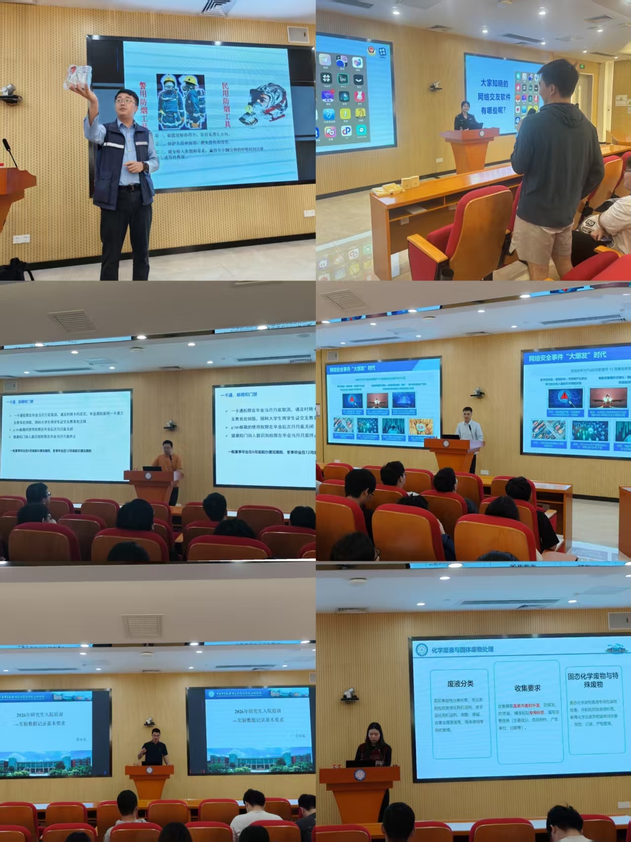 在消防安全培训中,培训专员通过案例分析、设备实操与疏散演练,让学生在“听、看、练”中掌握防火自救技能。广州市黄埔分局民警结合近年高发的电信网络诈骗案例,“以案释法”拆解诈骗套路,详解防范技巧与维权途径,提升学生的防范意识与法治观念。教育处老师深度解读研究生教育规章制度、培养流程与管理要求,为学生明晰学业发展路径。网络中心老师系统讲解了网络安全风险与防护策略。数字生物医学研究中心单永礼研究员则聚焦科研数据记录的规范性与严肃性,引导学生树立严谨求实的科研态度。综合处的老师详解实验安全管理要求及园区生活服务流程,助力学生安心开启科研生活。