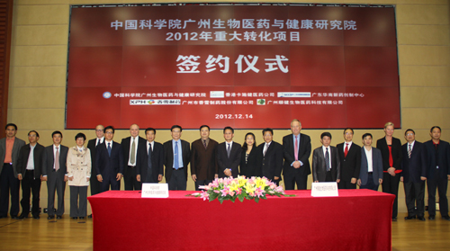 12月14日,中国科学院广州生物医药与健康研究院(简称广州生物院)在萝岗会议中心隆重举行“中国科学院广州生物医药与健康研究院2012年重大转化项目签约仪式”。中国科学院广州分院院长黄宁生,广东省科学技术厅副厅长余健,广州开发区管委会主任、萝岗区委书记骆蔚峰,广州市科技和信息化局副局长王越西等出席仪式并致辞。