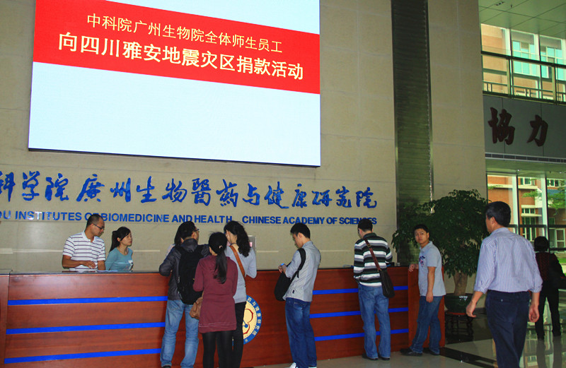 4月20日,四川芦山发生7.0级地震,造成重大人员伤亡和财产损失。为发扬一方有难,八方支援的优良精神,中科院广州生物医药与健康研究院于4月27日上午组织开展了向地震灾区捐款活动。活动通知发出后,广大师生员工积极响应,纷纷伸出援助之手,表达了对灾区群众的深情关切。