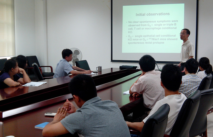 储文明介绍了G蛋白中的Gi1/Gi2/Gi3在小鼠结肠癌发生中的作用机制及其对DC细胞功能的影响和天然免疫受体TLR的关系,并重点介绍了他实验团队正在进行的乳腺癌和肝癌发生的预防性研究成果。报告结束后,与会科研人员及研究生提出了许多专业性问题,大家进行了热烈的讨论。储文明认真地回答了每一个问题,并就炎症在肿瘤发生和治疗中的辩证关系等问题与大家进行了分析和介绍。访问期间,双方还就肿瘤预防、治疗中老药新用和联合生物治疗等研究领域的合作可行性进行了探讨。