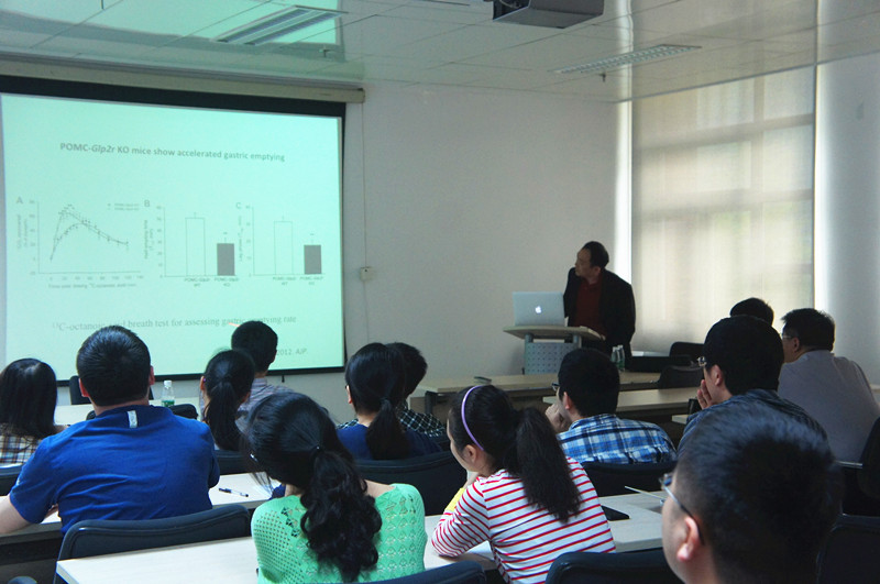 关新富重点讲述了肠道激素通过中枢神经系统进而对肠道生理活动进行调控的相关研究。其实验团队利用基因修饰小鼠,研究了GLP2肽对糖摄取和胰岛素敏感的调控机理,并阐明了相关信号通路,对肥胖和糖尿病相关研究具有重要指导作用。 报告吸引了研究院广大师生员工的积极参与。报告会后,关新富与赖良学研究团队就猪模型上的合作进行了深入探讨。