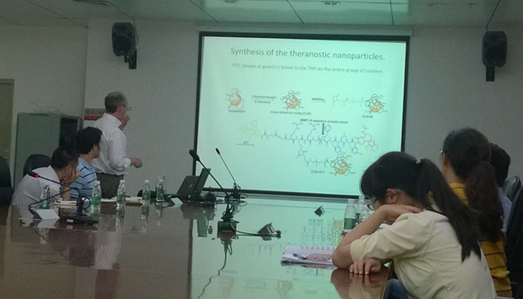 Laurence Patterson向大家介绍了目前癌症药物治疗研究上较为广泛的药物,如作用于肿瘤区域新生血管的基质金属蛋白酶、定向于肿瘤细胞色素P450的细胞毒素、抗肿瘤转移的趋化因子以及整合素等的靶点的前体药物,并对此一一作了详细讲解。Laurence Patterson还与大家分享了利用纳米药物载体对肿瘤地区进行检测、治疗的新思路和其实验团队的最新阶段性成果。整个报告气氛热烈,听众受益匪浅。