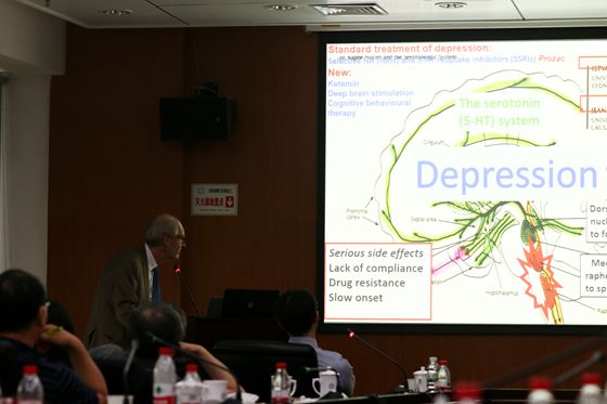 Tomas Hökfelt教授,丹麦国王医院Jens Rehfeld教授、首都医科大学徐志卿教授、香港城市大学李英教授、贺菊方教授以及部分来自香港城市大学和首都医科大学的青年学者和博士研究生分别到会作了精彩的学术报告。研讨会还邀请到了首都医科大学副校长王晓民教授、加拿大卡尔加里大学胡宾(Bin Hu)教授、中山大学一附院神经科副主任兼实验室主任裴中教授、广州生物院新药研发首席技术官Micky D Tortorella参与讨论。