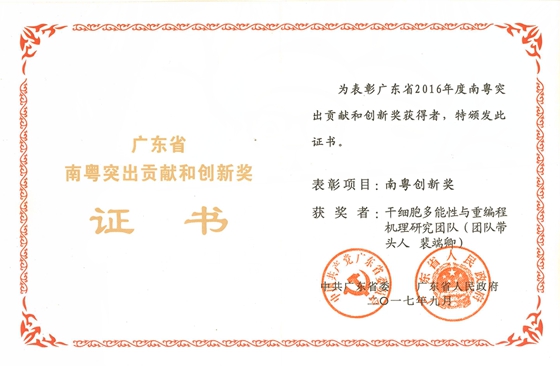 12月26日,2016年度南粤突出贡献奖和南粤创新奖的颁奖仪式在广东省政府举行,中科院广州生物医药与健康研究院干细胞多能性与重编程机理研究团队喜获南粤创新奖。