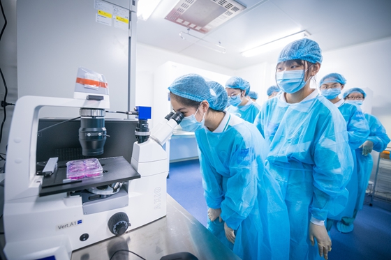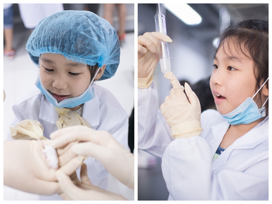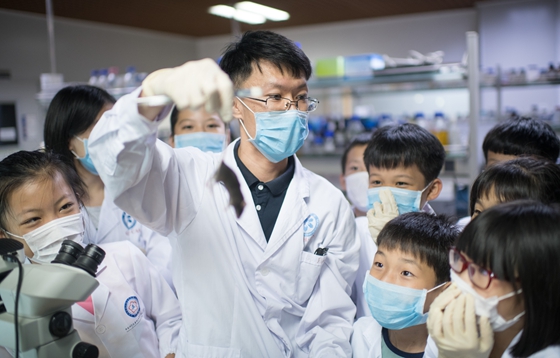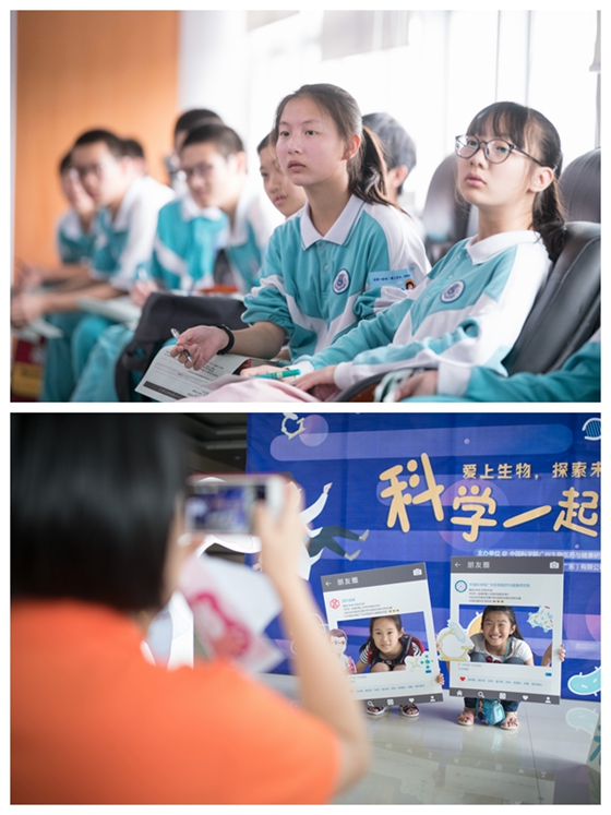 在互动小实验环节,学生纷纷穿上实验服,并戴上手套,体验一把科学家的瘾。在一线科研人员、学生的指导下,学生们动手操作了“魔棒点灯”、“吹气变色”、“神奇的瓶子”的化学小实验。凤凰中英文学校的初中生则走进细胞制备车间,尝试提取尿液细胞。来自中山大学、广州医科大学等学校的大学生在听完两个前沿科学讲座后,详细地了解了招生政策解读以及暑期夏令营推介。