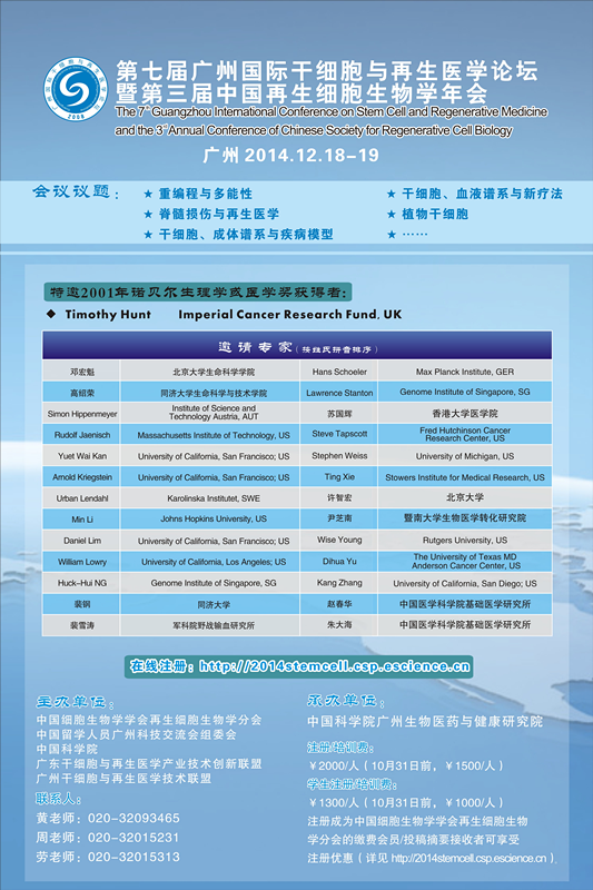 第七届广州国际干细胞与再生医学论坛暨第三届中国再生细胞生物学年会,将于2014年12月18-19日在广州举行。