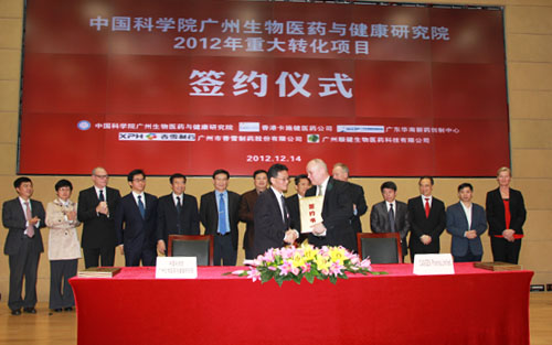 12月14日,中国科学院广州生物医药与健康研究院(简称广州生物院)在萝岗会议中心隆重举行“中国科学院广州生物医药与健康研究院2012年重大转化项目签约仪式”。中国科学院广州分院院长黄宁生、广东省科技厅副厅长余健、广州开发区管委会主任骆蔚峰、广州市科信局副局长王越西、等领导出席仪式并致辞。香港科技园、广州开发区科技和信息化局、部分广州市风险投资公司以及生物医药企业代表出席签约仪式,签约仪式由广州生物院院长裴端卿主持。
