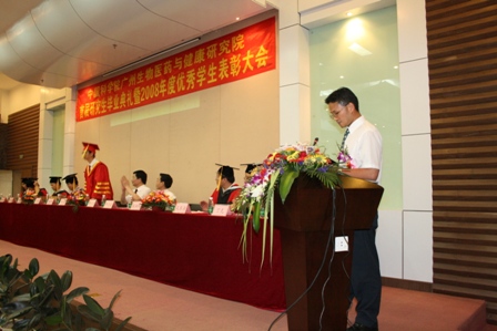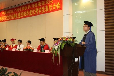 陈凌代表研究院作了致辞。他首先向各位毕业生及获奖同学表示热烈祝贺,并向长期以来支持我院教育事业的各位领导,向前来观礼的毕业生的亲属们表示热烈的欢迎和衷心的感谢。他说,经过四年的努力,我院各项工作进入快速发展的轨道,研究生已成为我院“创业创新、跨越发展”不可缺少的生力军,希望同学们“知礼诚信,敢于超越,阳光向上,勇于担当”,牢记中科院学子的使命和责任,成为无愧于时代、无愧于国家社会的栋梁之才。黄宁生、牛立文也分别致辞,向我院首届毕业研究生表示衷心的祝贺和祝福,同时作为见证人回顾了我院教育发展的历程,期望我院不断发展,祝愿广州生物医药与健康研究院的明天更美好。导师代表丁克研究员、“三好学生标兵”2006级博士生李华鹏同学、优秀毕业生况利平同学也分别在大会上作了发言。