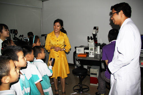 随后,师生们兴致勃勃地参观了生物院公共仪器中心和感染与免疫研究中心。仪器中心工作人员详细介绍了各种生物仪器的功能特点并作了现场实验演示。学生们对各种实验仪器充满好奇,并提出许多感兴趣的问题,工作人员进行了通俗易懂的讲解。为加深同学们对生命基本形态的认识,感染与免疫研究中心工作人员还现场组织学生们独立观察显微镜下的正常细胞的形态与生长过程。