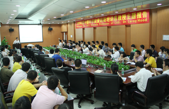 7月26日,中科院2011年度“爱因斯坦讲席教授” Leroy Hood 在广州生物医药与健康研究院作了题目为“Systems Biology,Transformational Technologies and the Emergence of Proactive P4 Medicine”的学术报告。广州生物院院长裴端卿主持报告会并为Leroy Hood 教授颁发了爱因斯坦讲席教授证书。