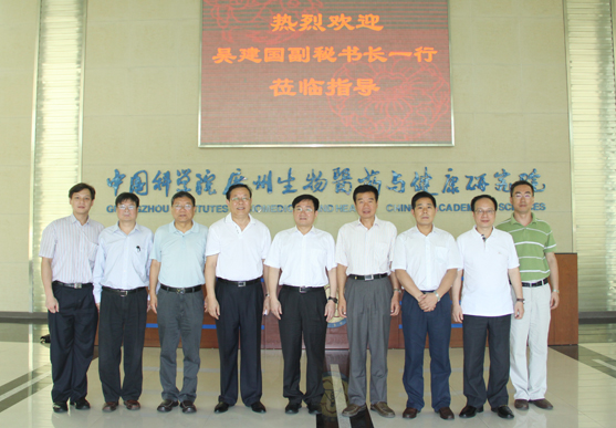 11月7日,中国科学院副秘书长吴建国到广州生物医药与健康研究院调研科研创新的行政后勤保障工作。广州生物院党委书记黄建冲、副院长朱咏峰、副院长邢雪荣接待了吴建国一行。