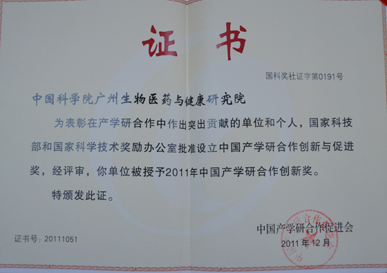 2011年12月17日,在中国产学研合作创新大会暨2011中国产学研合作促进会年会上,“2011年度中国产学研合作创新与促进奖”揭晓并颁发,广州生物院荣获第三届中国产学研合作创新奖(国科奖社证字第0191号)。