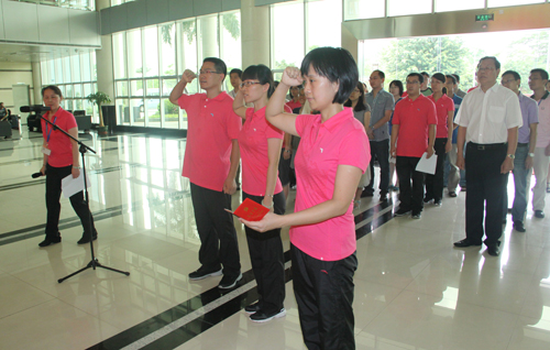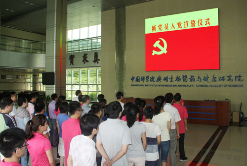 6月27日下午,中科院广州生物医药与健康研究院药物开发体系(DDP)党支部在研究院大厅隆重举行了新党员入党宣誓仪式。仪式由党支部书记刘小蓉主持,院党委书记黄建冲、党支部全体党员、全院入党积极分子和其他团队党支部党员代表参加了仪式。