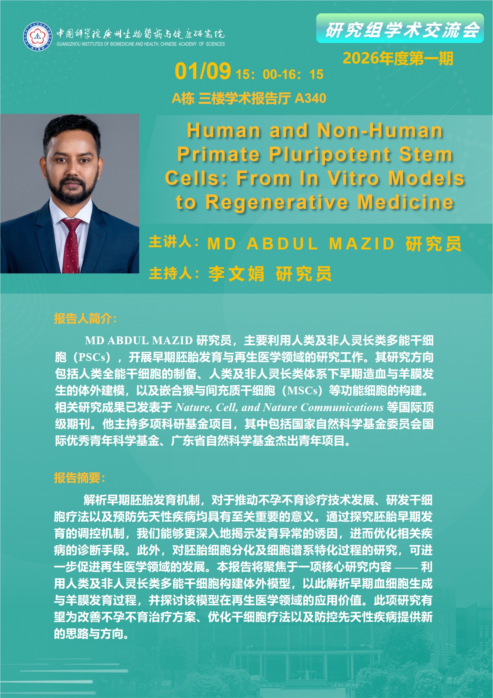 2026年1月9日研究组学术交流会(2026年度第一期):Human and Non-Human Primate Pluripotent Ste Cells: From In Vitro Models to Regenerative Medicine